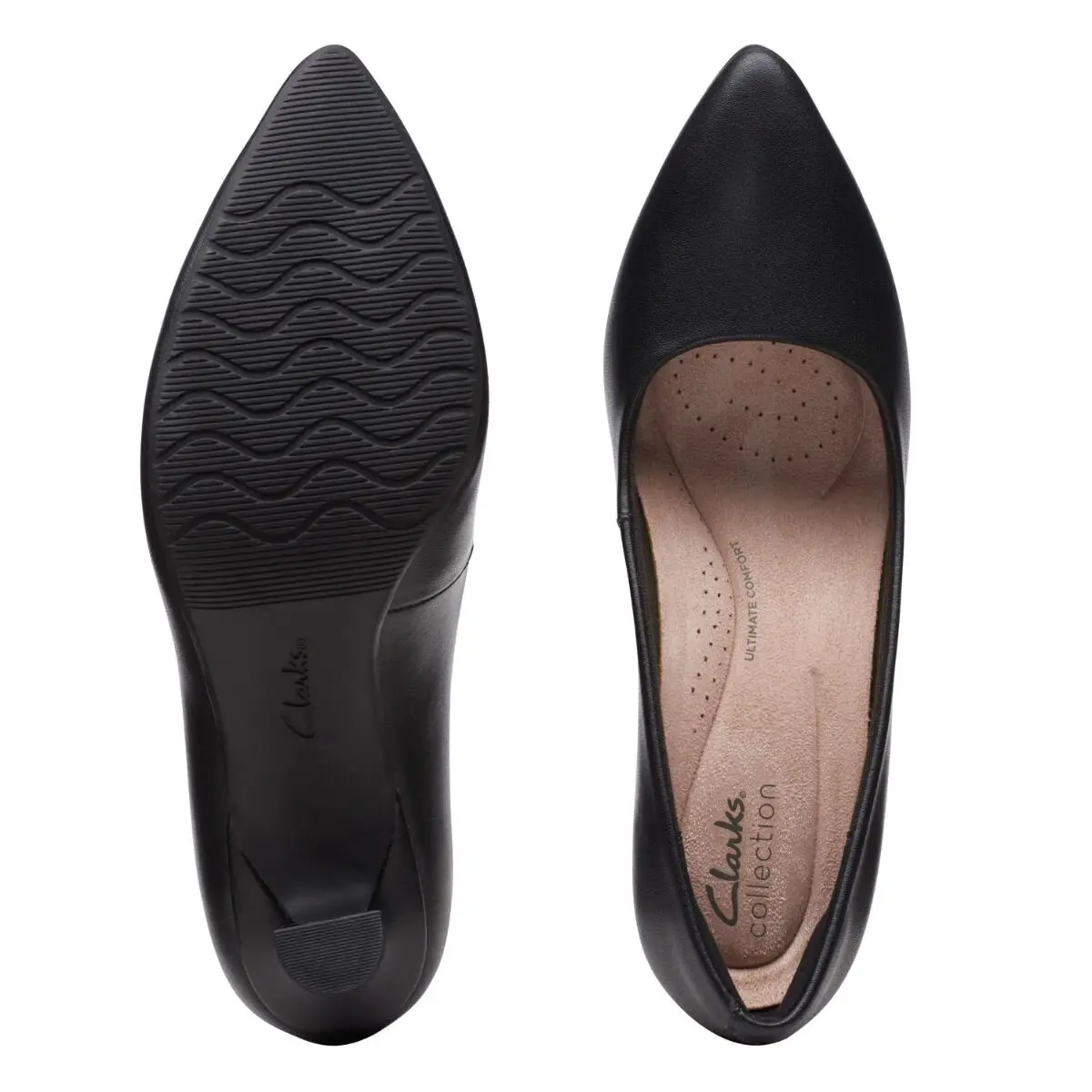 Elevate your style with the Clarks Kataleyna Gem black pumps, where sophistication meets comfort. Crafted with a sleek leather upper, these pumps feature a chic pointed toe and a flared heel that adds a touch of modern elegance. The slip-on design ensures effortless wear, while the textile lining and ultimate comfort footbed provide all-day ease. Finished with a durable rubber outsole, these pumps are perfect for making a polished impression from day to night..
